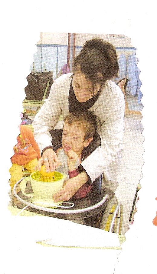 Daniel es un niño al que no le gusta nada pero nada de nada que le prueben cosas nuevas, todo lo que sea un sabor diferente o una textura que no es la habitual le da un asco horroroso, pero con esto del taller de cocina ya que experimentan continuamente con sabores y texturas están consiguiendo que no le de tanto reparo probar cosas nuevas. Además participan activamente en el taller y prueba de ello es la foto que cuelgo para que lo veais. Yo me reí cuando la vi el primer dia que la trajo en el cuaderno de comunicación porque vi a Daniel disfrutando cuando hacian un zumo de naranja. En la foto está con su profesora Chus, que es un encanto y le está enseñando a exprimir una naranja.