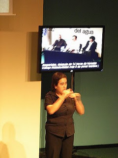 La mejor ayuda sin duda la han recibido las personas sordas. Dos traductoras al idioma de los sordos se han turnado durante las intervenciones. Y para la charla-coloquio de Francisco Taibo han contado con una pantalla lateral más pequeña en la que iba apareciendo subtítulos que reproducían la charla y conversación. Para que esto fuera posible, una taquígrafa ha estado volcando dichas charlas y conversación al sistema audiovisual. Un trabajo digno de elogio, dada la rapidez y densidad expresiva de la oratoria del señor Taibo, muy ameno por otro lado, ciertamente.
