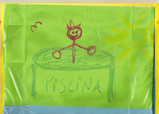Ayer fue el último día para Daniel pero el campamento continúa durante todo el mes de Agosto así que todavía disfrutarán los niños que vayan este mes. Me trajo una carpeta que han hecho en uno de los talleres hecha con dos tetrabriks de leche reciclados (todo hay que decirlo) y en la portada de la cual está este dibujo que os pongo que imagino yo que será Daniel dentro de la piscina y que le habrán ayudado a hacerlo. Tambien le entregaron el diploma al mas risueño, aunque no lo parezca a veces.