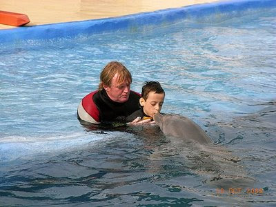 Daniel volvió ayer de Benidorm. Esta tarde ha venido a verme con sus padres y me ha traído un montón de fotografías de sus días en Mundomar. Os dejamos un par de reconfortantes imágenes de Daniel, la delfina María y su hijo, el delfín David, y Branco, el fisioterapeuta. En cuanto el ordenador de Inma resucite (está un poco off, el pobre) ella nos contará cómo ha ido la experiencia, las cosas aprendidas, las perspectivas… Todo eso.