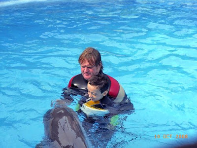 Daniel volvió ayer de Benidorm. Esta tarde ha venido a verme con sus padres y me ha traído un montón de fotografías de sus días en Mundomar. Os dejamos un par de reconfortantes imágenes de Daniel, la delfina María y su hijo, el delfín David, y Branco, el fisioterapeuta. En cuanto el ordenador de Inma resucite (está un poco off, el pobre) ella nos contará cómo ha ido la experiencia, las cosas aprendidas, las perspectivas… Todo eso.