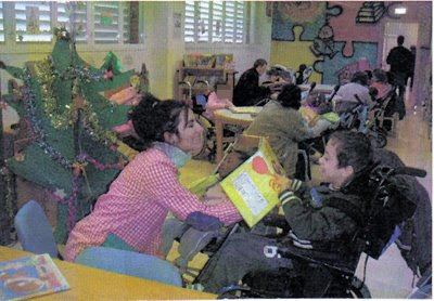 Como todavía no tenemos fotos del ensayo hipo-virtual, coloco por aquí una foto que Daniel trajo el mismo día. En ella aparece junto a su profesora en la biblioteca del centro cívico del barrio de San José, donde está ubicado el colegio Angel Riviere. Parece que se lo pasaban pipa revisando el libro.
