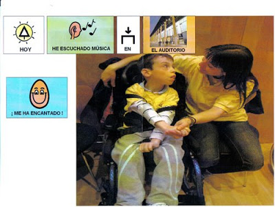También trajo un reportaje completo sobre una anterior visita al Auditorio de Zaragoza donde escucharon a una orquesta y vieron los Títeres manipulados por Asunción y a Javi el Mago. De todo ello nos hemos enterado mediante unos estupendos y muy claritos pictogramas: Mima, disculpa que no los incorpore todos al post, pero es que creo que también los pictogramas tienen derechos de autor. De vez en cuando pongo alguno, parcialmente y tal. Pero no me atrevo con una explicación pictográfica completa. Por si acaso. Esta visita formaba parte de los actos especiales de celebración de la semana de la música, que contó con actividades específicas dentro del colegio: