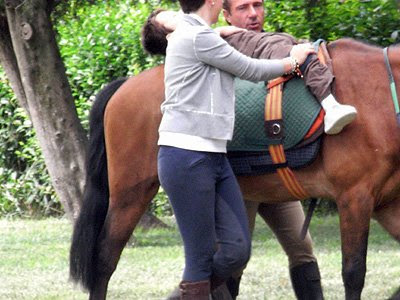 Daniel se muestra tan emocionado cuando le toca montar al cabalo que al principio cuesta un poco relajarle y conseguir que se adapte a la postura sobre el animal, tan dócil Obélix, tan sabio. En este sentido, el trabajo de Enrique (el jinete que conduce a Obélix) es magnífico: le ayuda a Daniel a distenderse a base de guiar algunos de sus movimientos y hablándole con muchísima tranquilidad. Después de estos momentos, se inicia la marcha por el parque y Daniel muestra su alegría abiertamente. Le gusta muchísimo ir sobre Obélix, por eso se deja llevar bien por él y por Enrique. Sobre el caballo a Daniel le colocan de forma natural, sentado a horcajadas, y también tumbado de espaldas, para que perciba bien el ritmo y tendencia del andar de Obélix. Obélix al caminar le dice al cerebro de Daniel lo que sus piernas no pueden decirle. La foto que cuelgo no es buena (es muymuymuymalamala), pero se ve bien esta postura de espaldas de Daniel sobre el caballo.