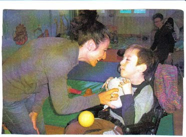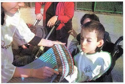 En esta otra fotografía, Chus, la profesora de Daniel, está proponiéndole distintas experiencias táctiles. Parece un peluche lo que Daniel sostiene entre sus manos, y la verdad es que su expresión resulta muy muy graciosa: supongo que la suavidad del tacto del peluche le gustó mucho.