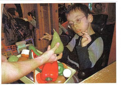 Si no estoy mal informada, tanto esta fotografía como la siguiente corresponden a una salida fuera del colegio, a un local de juegos infantiles. En esta primera la cosa va de reconocer frutos y hortalizas (son de plástico, claro). Veis a Daniel, con gafas, estudiando seriamente la forma de la pera. La verdad es que todas estas actividades las aprovecha muy bien porque a menudo nos sorprendemos en casa cuando nos damos cuenta de toda la información acumulada por él: sabe un montón de cosas. En cuanto a las gafas, que antes aguantaba bastante mal, ahora Daniel las pide a menudo cuando tiene real interés en ver muy bien alguna cosa: dibujos animados, por ejemplo….