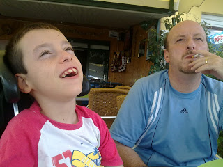 Como aún no hemos dado con el asiento mas adecuado para él, se nos ocurrio que en vez de ducharlo de pie, se sentaran padre e hijo en el suelo de la ducha para que Daniel estuviera mas comodo y no le molestase la cadera. Pues fue un auténtico éxito. Como la ducha es adaptada y tiene una mampara en la que la puerta tiene dos partes, yo desde fuera les doy con el telefonillo de la ducha y los remojo y la verdad es que disfruta más de lo que yo pensaba. Todo esto viene a que este verano nos hemos ido a Cambrils unos días y alli no hay ducha, hay bañera, por lo tanto yo pensaba que a Daniel le iba a encantar volver a estar a remojo y flotando despues de unos cuantos días de ducha diaria. Nuestra sorpresa fue que además de disfrutar del baño a remojo, Daniel buscaba y jugaba con el grifo abierto que dejó su padre de casualidad y sin darse cuenta supongo que porque se acordaba de que yo les enredo con la ducha y juego con ellos desde fuera.