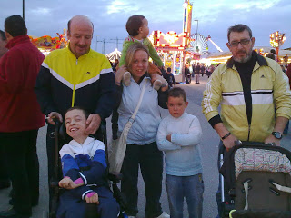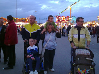 Quedamos con mi hermana y mis sobrinos en las Ferias, para que mi sobrino Victor disfrutase un ratico montandose en los cacharrillos, y jugando en las tombolas y cosas asi. Lo cierto es que desde que las ferias las hacen en Valdespartera es de agradecer que la zona por donde se camina esté asfaltada ya que es mucho mas facil ahora manejarse con la silla de ruedas por allí.