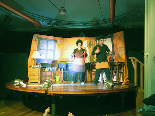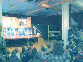 5. La función fue encantadora (y muy profesional). Almozandía despliega un buen puñado de recursos (gestuales, humor, lenguaje, trucos mágicos) para construir un espectáculo infantil actual, realista y fantasioso a un tiempo, dosificando unas cuantas recetas pedagógicas y educativas muy acertadas, trufadas entre diálogos que se construyen con la agilidad y la frescura del propio pensamiento infantil: de hecho los chicos se adelantan en ocasiones a la réplicas de los actores en escena. Un diálogo constante entre la escena y público, vamos. Y un mensaje muy adecuado para todos (adultos también) en estos tiempos: magia -imaginación- y diversión están por todas partes, en cualquier cosa (es una cuestión de actitud). Sacarino y Cuchufleta se ganaron a los chicos y chicas completamente. A todos los chicos (unos aplaudían, botaban, bailaban en el sitio; otros se agitaban un poco en sus sillas, reían, movian sus cabecitas, se expresaban también a su manera). Y en lo que a Daniel respecta soplaba con la cocinera-maga Cuchufleta cuando ella soplaba para hacer magia. Soplar no es fácil: que lo digan los logopedas. Acabó empapado de tantos nervios y emociones.