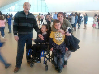 Aquí veis a Daniel, con sus padres y su primo Víctor durante el descanso de Sonrisa y Lágrimas.  Había que dejar constancia del momento, después de toda una semana de nervios y ansiedad y de un domingo aún más lleno de nervios. Daniel llegó literalmente «atacado» de impaciencia. Incluso andábamos un tanto preocupados, porque su emotividad (que por carácter es ya muy fuerte) se dispara potencialmente debido a su afectación cerebral. Así que hay que ir en este tema con un cierto cuidado y buscando reequlibrar en lo posible las sensaciones.