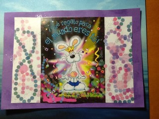 Y yo más contenta. Porque la reunión ha comenzado con esta postal de felicitación que Daniel (con ayuda de su profa, claro, gracias Viriginia) hizo ayer, y que ha sido entregada con gran fiesta y golgorio, acompañada de la canción «Cumpleaños feliz», personalizada para la moi a través de una grabación en pulsador. Todavía estoy bailando.