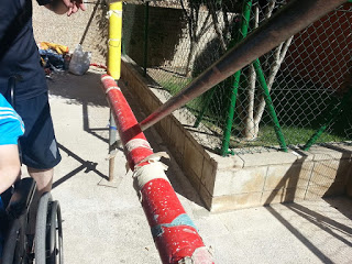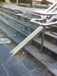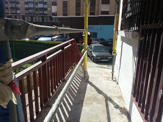 En fin, un desastre de estructura, que lleva delante de la casa ya casi dos meses y lo que queda (estamos en agosto). Ni la empresa adjudicataria, ni tampoco la comunidad de propietarios, claro, han tenido en cuenta criterios de accesibilidad de ningún tipo, no sólo respecto a las personas que pueden ir en silla de ruedas, sino para muchas otras circunstancias: porque os aseguro que por allí no pasa una camilla, por ejemplo. Por no pararnos en situaciones mucho más cotidianas, porque estamos hablando de un edificio donde viven bastantes personas mayores, y no quiero ni pensar en mi madre tirando del carro de la compra por las escaleras…