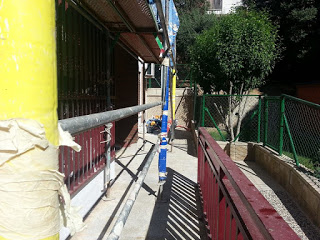 Hace unos días Inma denunció en Facebook, y también en las instancias correspondientes del Ayuntamiento de Zaragoza, la forma en que había colocado el andamio la empresa que lleva a cabo los trabajos de rehabilitación de la fachada del edificio donde viven la abuela y la tía abuela paternas de Daniel. Estas son las fotografías que pudo realizar.