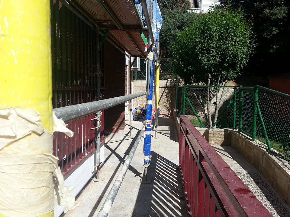 El andamio ocupa buen parte de la zona de paso hacia el portal. Esa zona además está precedida por escaleras. Hay una rampa en paralelo; pero ha quedado inutilizada porque la estructura del andamio tiene una barra cruzada, que impide llegar a la puerta. De esta manera, tuvieron que subir la silla de Daniel a pulso por las escaleras, y después casi se queda atascada entre las barras verticales del andamio y la pared.