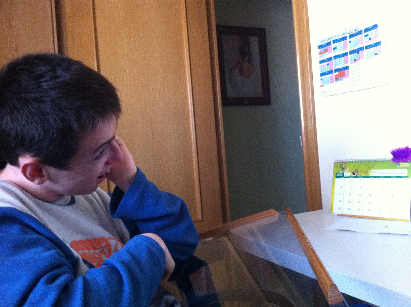 Esta fotografía se la tome mientras seguía en la pantalla del ordenador las evoluciones del corto animado clásico de Disney sobre la obertura de Guillermo Tell. Ya aludimos en un post anterior que esta colección histórica de la factoría Disney es –a pesar de todos los anacronismos que incluye y que hoy en día chirrían bastante- una imprescindible referencia para la animación. A Daniel le gustan bastante, y sigue los cortos animados muy bien en su desarrollo narrativo. Desde hace mucho tiempo vengo observando cómo la música le ayuda a comprender los relatos. Es como si para él esa función de la música en el cine, de refuerzo de la intención del relato, o de anticipación del mismo, etc … tuviera una importancia ineludible. Necesita de alguna forma ese apoyo “climático”. Igual que cuando le narras o lees un relato: si lo haces en tono monocorde parece costarle conectar con el desarrollo argumental. Si vas apuntalando el relato con una adecuada entonación, marcando tiempos, diferenciando voces, etc., entonces disfruta una barbaridad.