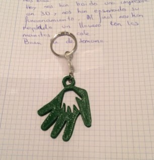 Os muestro un pequeño objeto realizado mediante una impresora 3d. Como veis es un llavero con la manita que representa al Colegio Ángel Riviere. Como explica el texto de la hoja del cuaderno de comunicación, a los educadores y alumnos del colegio les hicieron una demostración, hace unos días, de impresión en 3d. Y al final les regalaron este detalle.