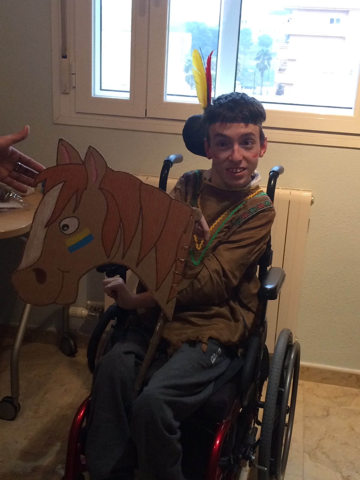 Aquí veis a Daniel probando hace unos días una silla nueva. Si le preguntas si quiere silla nueva dice que no, supongo que porque ahora a todo contesta que no. Es lo que toca. Sin embargo, le cambiaba la cara al probar la silla nueva, se le notaba muy a gusto sentado en ella, bien colocado y cómodo. La verdad es que su silla actual se le ha quedado pequeña antes de lo previsto. Estas sillas ortopédicas presentan por lo normal asientos y respaldos que recrecen, al estirar la estructura del chasis, hasta una cierta medida. Esta vez a Daniel la silla le ha venido a durar tres años justos. Estas fotos que os mostramos a continuación, además de ser simpáticas, sirven para calibrar la velocidad a la que su silla “se ha encogido”. Una es de la sesión de adaptación de la silla en la Ortopedia, o sea el primer día que se sentó en ella hace tres años. La otra de hace unas semanas, en Carnavales. Se ve claramente como la pobre silla ya no puede con Daniel, que por otra parte la ha vapuleado y maltratado como corresponde a un adolescente.