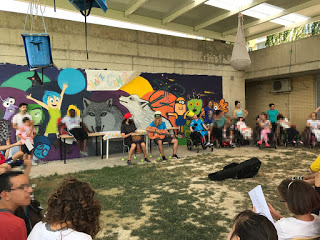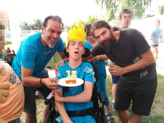 Ayer tuvo una fiesta por todo lo alto en el campamento de verano, con todos su compañeros estivales (muchos lo son también durante el curso) y los monitores y cuidadores. Os dejamos algunas fotos para que veáis lo que son capaces de montar esta gente. A todos, muchas gracias por esa macrofiesta de cumpleaños y por el cariño hacia Daniel y hacia todos los chicos. Permitidnos un particular achuchón a Carlos y Johny, también a Henar, que están como monitores en el Abierto por Vacaciones, y que ya son parte de nuestra pequeña tribu (los chicos aparecen pixelados porque no sabemos si todos cuentan con permiso paterno para salir en las fotos).