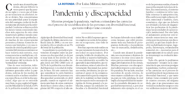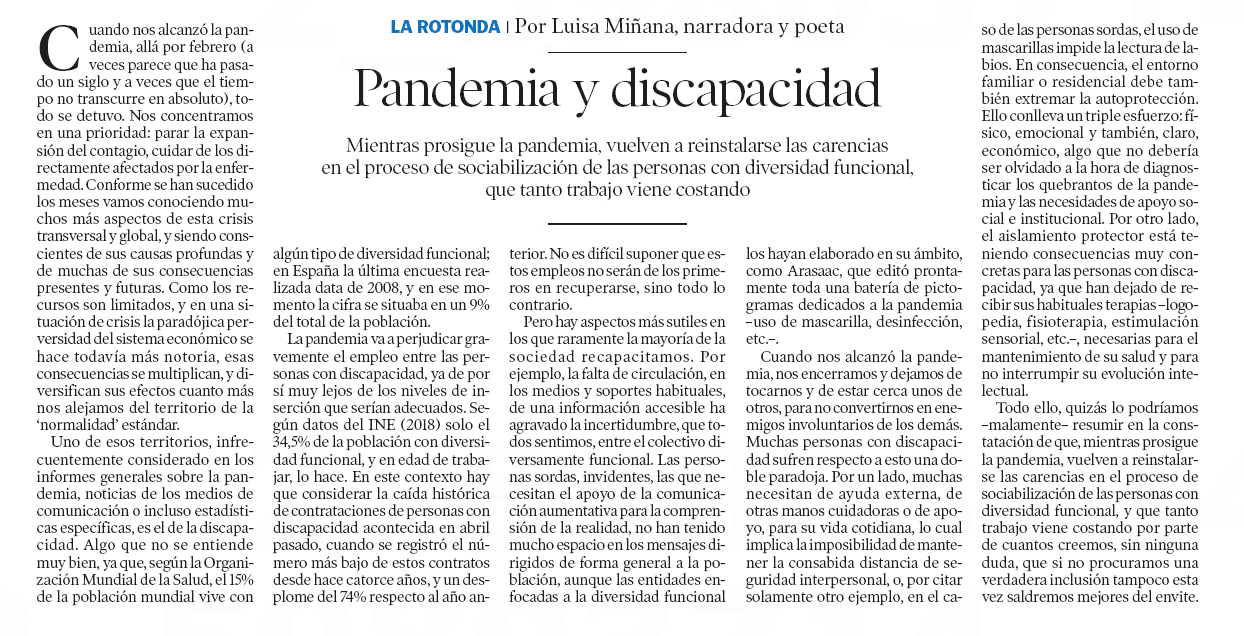 El pasado día 12 de septiembre publiqué un artículo en Heraldo en Aragón en el que intentaba poner de manifiesto algunas de las particularidades de los efectos de la actual pandemia dentro del ámbito de la vida en discapacidad. Sé que cada colectivo del conjunto de la sociedad, cada familia, cada persona sufre esta larga situación de forma semejante a otros, pero también de manera diferente en cada caso, cada cual con sus pequeñas o grandes particularidades. De algunas de estas particularidades somos más conscientes, de otras mucho menos. Creo que uno de los ámbitos menos conocidos (siempre y ahora) es el de la discapacidad, a pesar de que, como hemos dicho tantas veces, no sólo las cifras de ciudadanos que viven con alguna diversidad funcional son los suficientemente importantes como para que no fuera así, sino que cada uno de nosotros tiene muchas posibilidades de pasar a ser parte de ese colectivo en cualquier momento de nuestra vida, por múltiples causas.