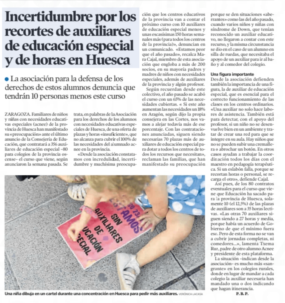 El recorte superior corresponde a la denuncia realizada en prensa (Heraldo de Aragón, 24 de julio de 2024) por las familias de los alumnos de Huesca con necesidades educativas especiales. Es un problema, el de la insuficiencia de dotación de plazas de auxiliares de Educación Especial, que, no sólo en Huesca, se viene repitiendo curso tras curso, en mayor o menor medida. La Educación Especial es la eterna cenicienta del sistema educativo, y muy posiblemente, si no nos empeñamos con tenacidad en evitarlo, las deficiencias no sólo no se subsanen, sino que pueden ir a más: vivimos un momento en que toda la educación parece orientarse a emitir en un futuro trabajadores aptos para las competencias que exigen las grandes empresas. Puro y salvaje capacitismo.