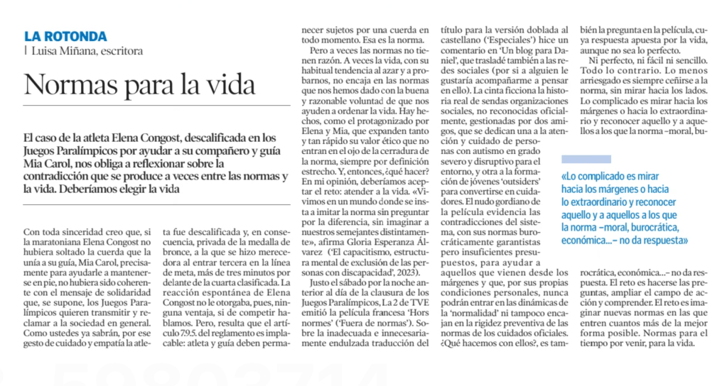 Traigo el artículo de opinión publicado en Heraldo de Aragón el domingo, 22 de septiembre de 2024, en torno a las normas y a la polémica generada en la maratón de los Juegos Paralímpicos, con la descalificación de Elena Congost por ayudar a su guía. Recoge el artículo también algunos de los aspectos ya comentados en este blog en torno a la película «Hors normes».