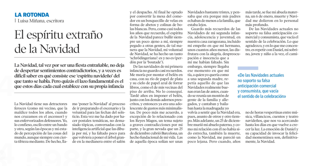 La Navidad tiene sus detractores feroces (como mi vecino, que la maldice todos los años, cuando nos cruzamos en el ascensor) y sus enfervorizados defensores. Yo, lo confieso, oscilo entre un bando y otro, según las épocas y mi estado de percepción de las cosas del mundo, aunque siempre con cierta tibieza mediante. De hecho, llamo “poner la Navidad” al proceso de ir preparando el escenario y la voluntad para las fechas del solsticio. Esta vez me ha dado por hacer postales temáticas, no demasiado tópicas, conversadas con la inteligencia artificial que las dibuja por mí, y ha faltado poco para que volviera a poner el árbol grande en la medianera entre el salón y el despacho. Al final he optado por convertir la mesa del comedor en un bosquecillo de velas en forma de abetos y colinas de bolas blancas. Pero, como casi todos los años que recuerdo, el espíritu de la Navidad parece bullir siempre un poco ajeno a mí, siempre pegado a otras gentes, de tal manera que la Navidad, mi voluntad de Navidad, se ha hecho un tanto schrödingeriana: es y no es (perdón por la boutade).