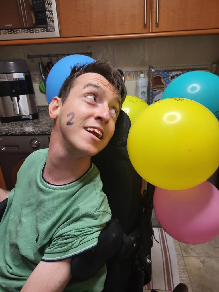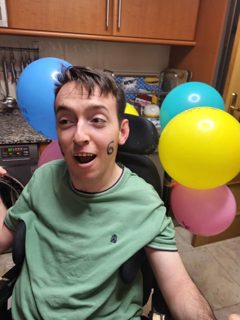 Hoy Gran Daniel cumple veintiséis añazos, y su madre le ha preparado esta marcha “en globos” hacia el centro de día. Escribo la cifra en letras para que me dé menos susto. Tened en cuenta que no pesaba ni dos kilos cuando nació, y ahora es más alto que yo. Han ocurrido tantas cosas en estos años, y me refiero solamente a cuanto tiene que ver con él, no sumo todas las demás que han sucedido en nuestro entorno y nos han sucedido, incluida esta consciencia cada vez más elocuente del tiempo que pasa y pesa para todos.